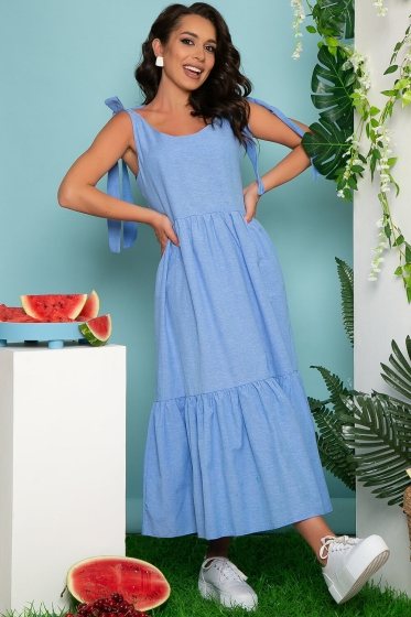 Сарафан из вискозы длины макси - тренд сезона лето`22! Бретели регулируются и завязываются на очаровательные бантики. Вырез горловины по переду и спинке одинаковый. Платье отрезное по линии талии, юбка скроена воланами. Силуэт свободный, платье без замков, без подкладки.