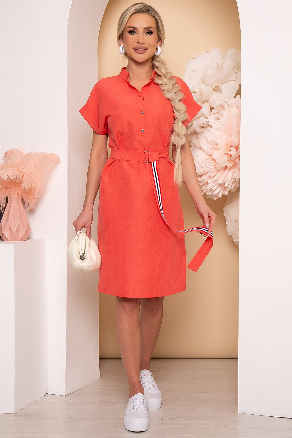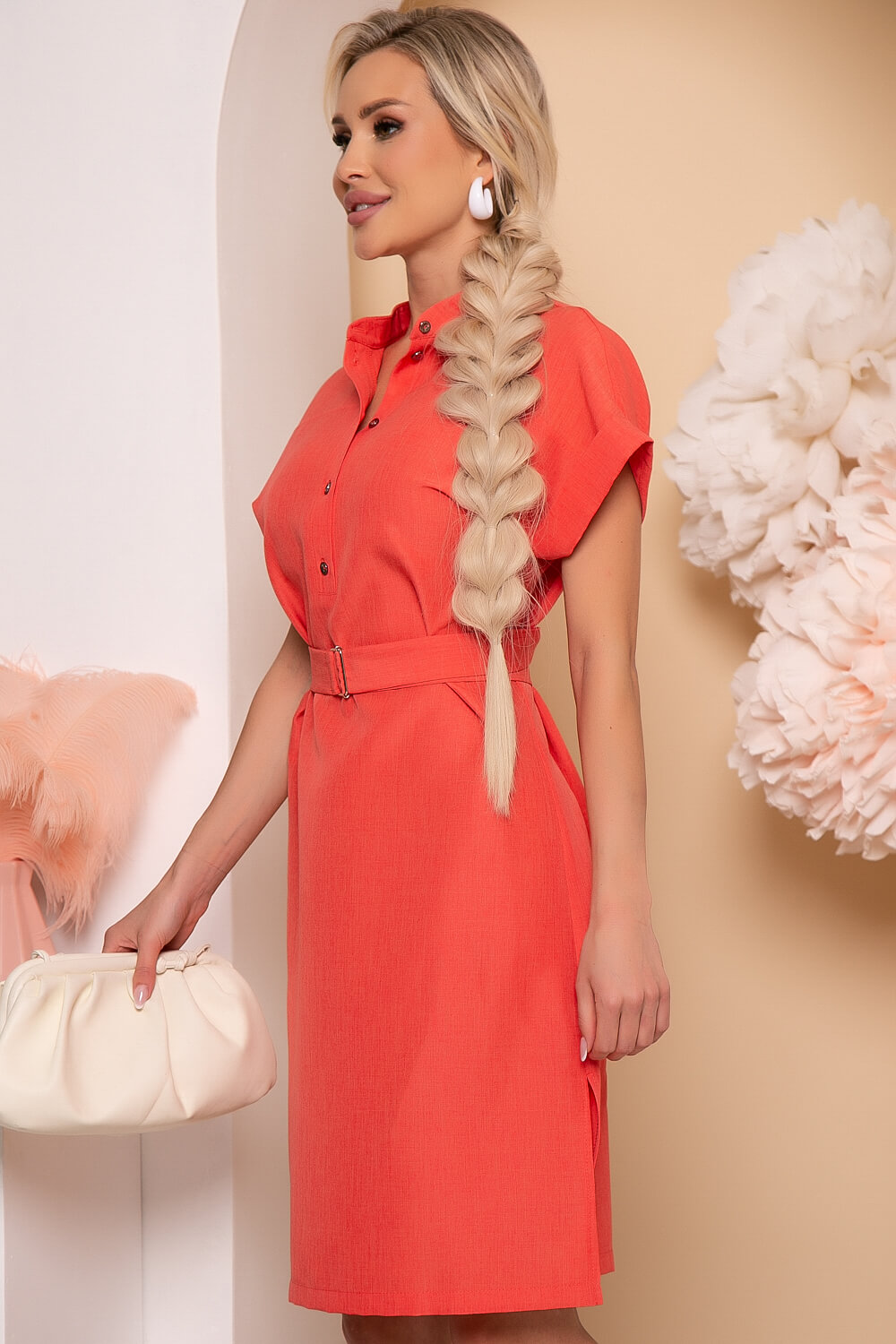 Платье на каждый день с акцентным поясом практично и неприхотливо к выбору аксессуаров. Можно сочетать с туфлями на каблуке или кедами. Платье прямого кроя, горловина оформлена стойкой, по переду застёгивается на функциональные пуговицы. Рукав цельнокроенный, короткий, с отворотом. По низу платья по бокам есть разрезы. В комплекте пояс с металлической пряжкой.