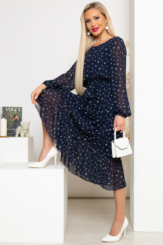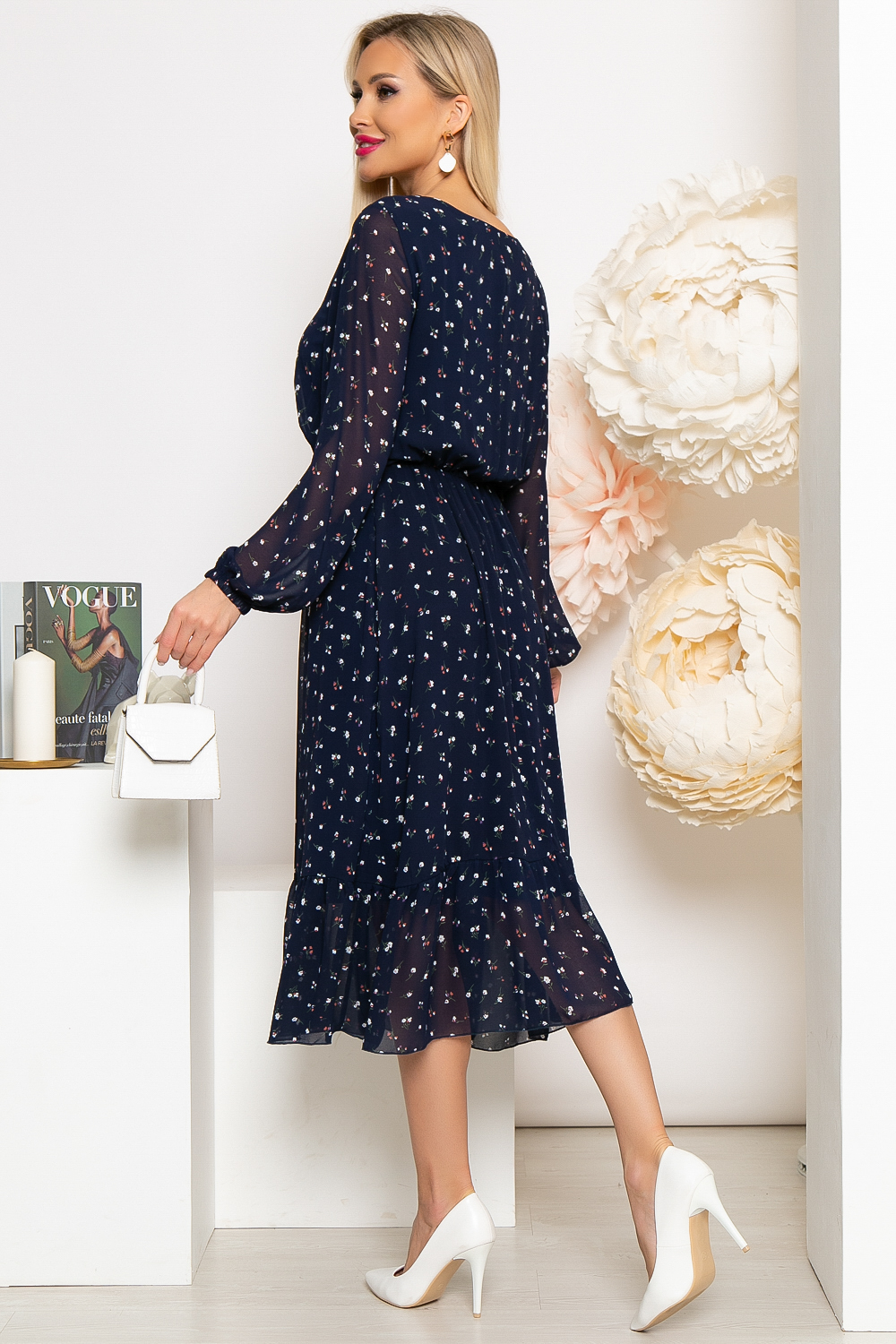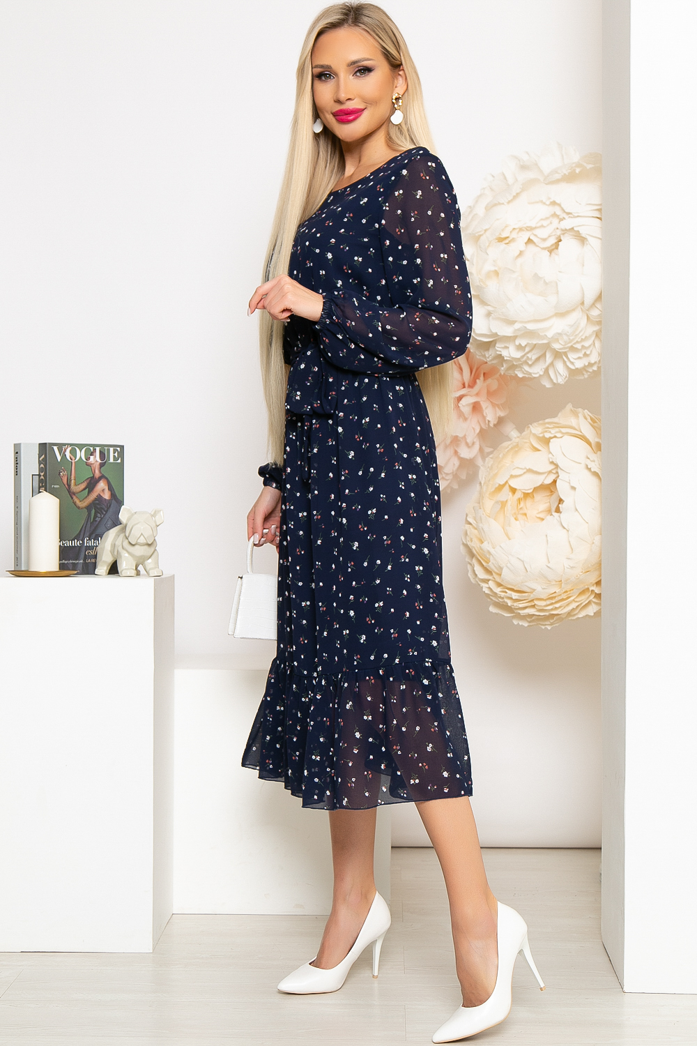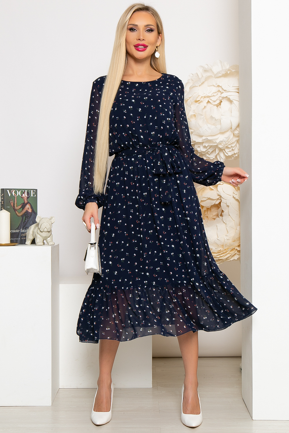 Шифоновое платье летящего кроя с нежным цветочным принтом прекрасно подойдет для создания романтичных повседневных образов в лений период. В прохладную погоду можно надеть с жакетом или пальто, а также дополнить образ фетровой шляпкой. Платье на подкладке, рукав втачной, длинный, низ на резинке. Мягкий округлый вырез горловины, талия на резинке, спинка разрезная. По низу платья широкий волан. В комплекте пояс из основной ткани.