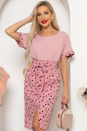 Элегантное платье в нежном оттенке розового подчеркнёт Вашу женственность, а его интересный крой расставит грамотные акценты в образе. Платье полуприлегающего силуэта, по переду защипы в области груди и талии, юбка разрезная по переду с деликатным разрезом, приоткрывающим ножки. Рукав укороченный, с манжетом. В комплекте пояс-кушак, позволяющий красиво подчеркнуть талию.