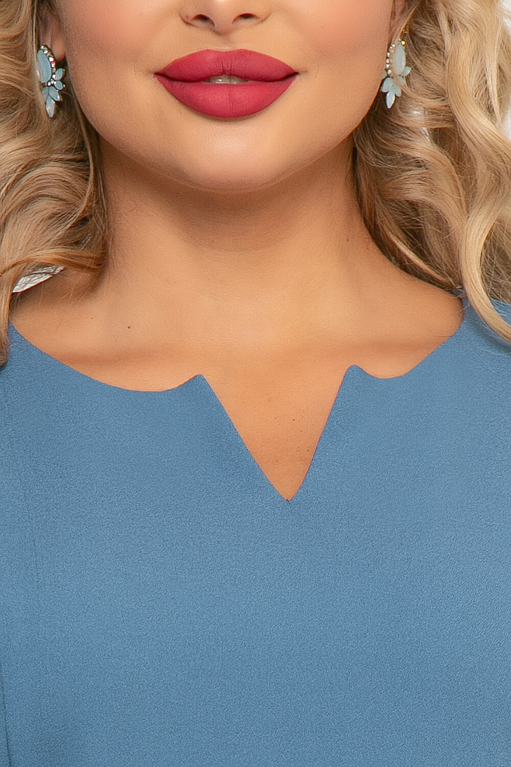 Элегантное платье на каждый день в красивом голубом оттенке. Фигурный вырез горловины создаёт красивый акцент на зоне декольте. Комфортный рукав, сзади по спинке разрез. В комплект входит пояс из основной ткани.