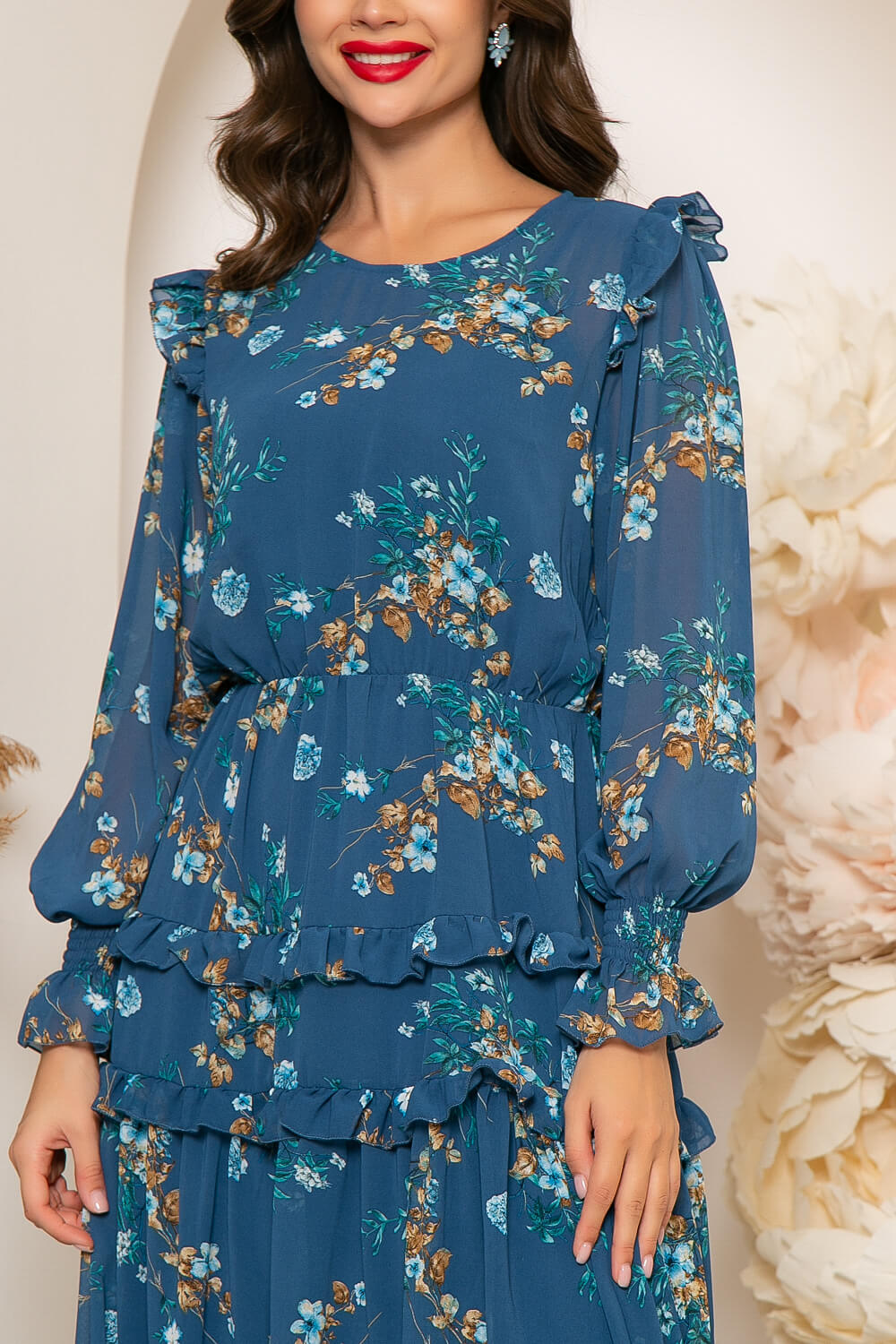 Шифоновое летящее платье с романтичными и игривыми оборками. Платье свободного силуэта на подкладке с длинным рукавом, отрезное по линии талии, рукав втачной длинный, по низу рукава рюша. Юбку и плечевой шов тук же украшают рюши.