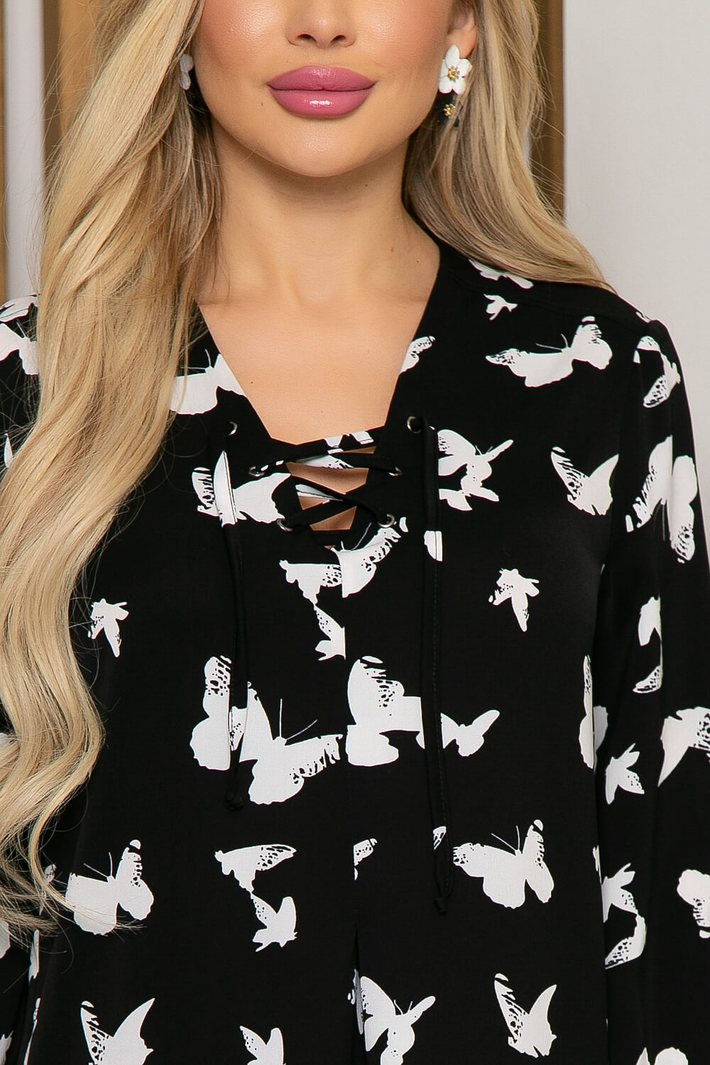 Платье-туника свободного кроя со шнуровкой. По бокам есть разрезы, спинка удлинена. Втачной длинный рукав на резинке. В комплект входит пояс из основной ткани. Платье без подкладки.