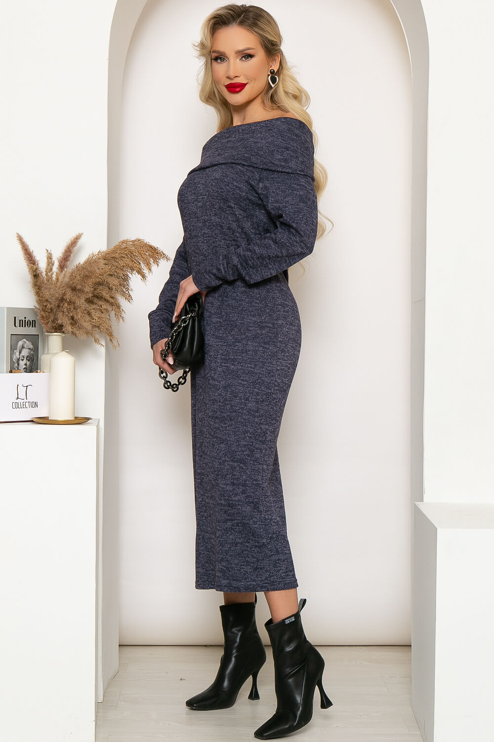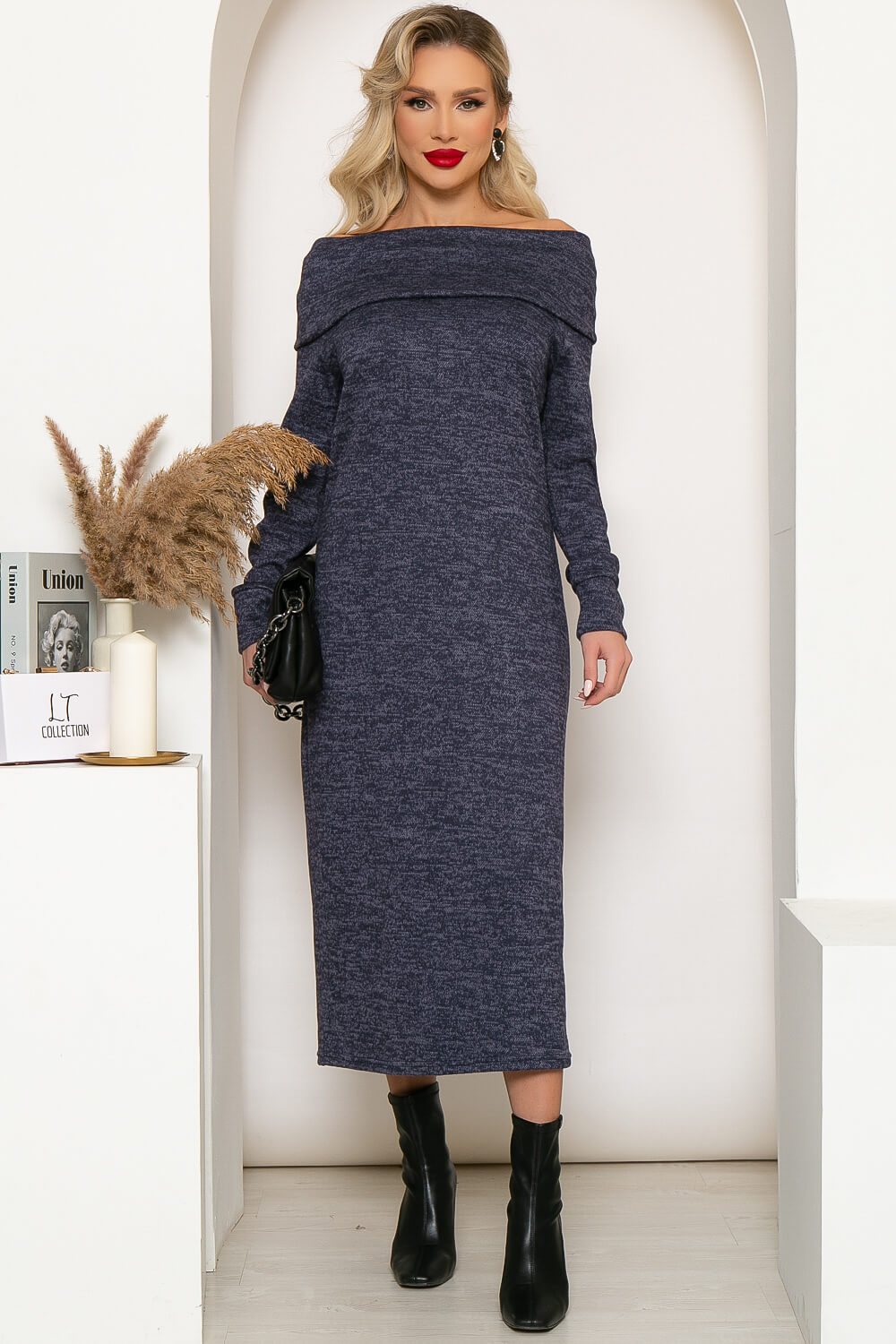 Теплое платье из уютного мягкого трикотажа "Меланж" с воротником-стойкой подарит тепло и комфорт в осенне-зимний период. Воротник можно укладывать двумя разными способами: свободно вокруг горловины, как хомут или спустить на плечи, приоткрыв их. В сочетании с длиной миди, платье, спущенное на плечи, будет выглядеть стильно и интригующе. Длинные втачные рукава оснащены манжетами.