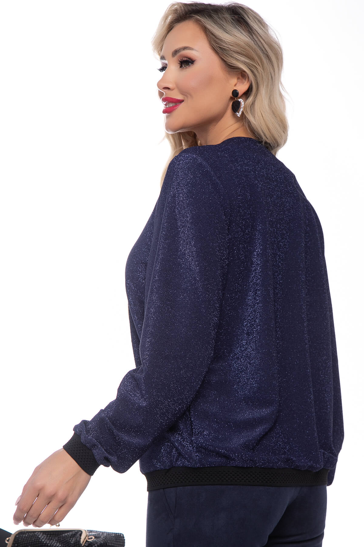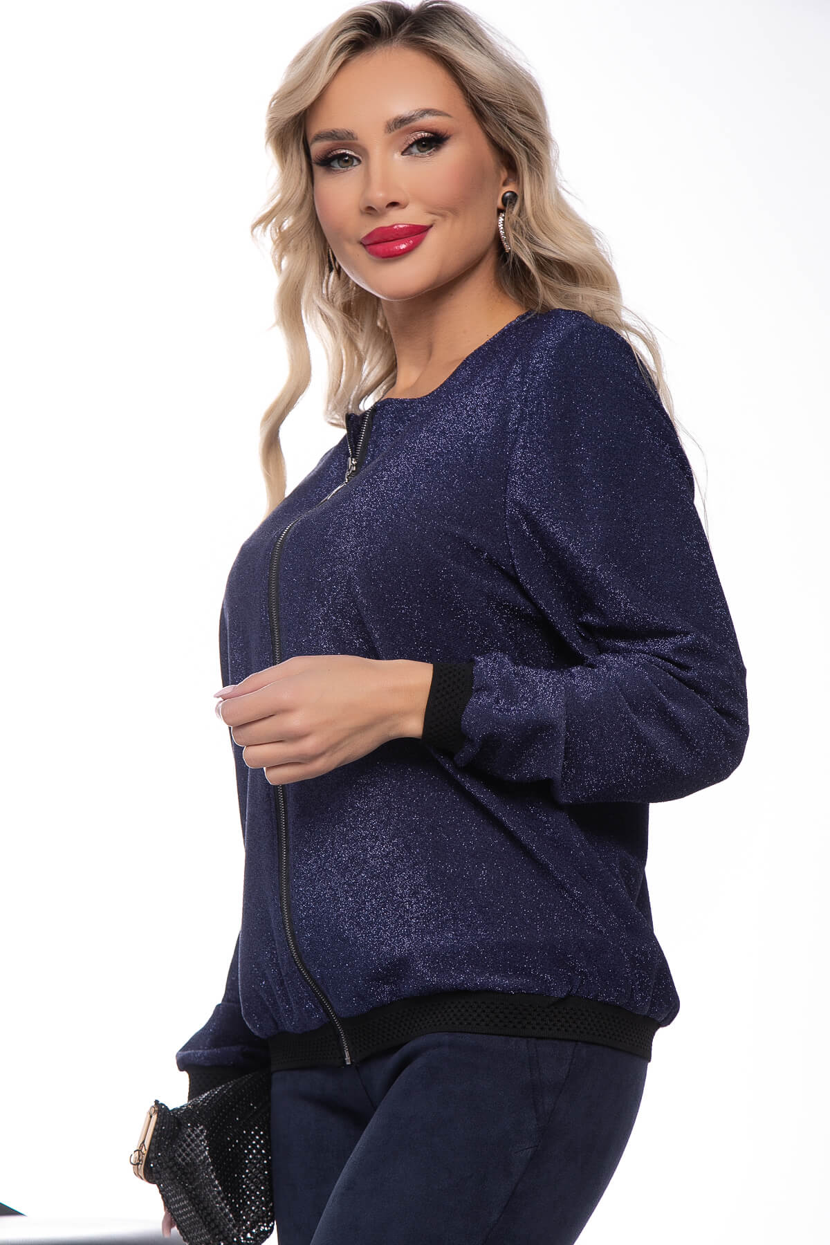 Бомбер из трикотажа с люрексом сделает вас звездой вечера! Это отличное дополнение к образу, который придает чувство праздника. Рукав длинный, втачной, по низу манжет. Изделие на молнии. Надевайте его на базовые топы, футболки или лонгсливы и окружающие точно не оставят вас без внимания!