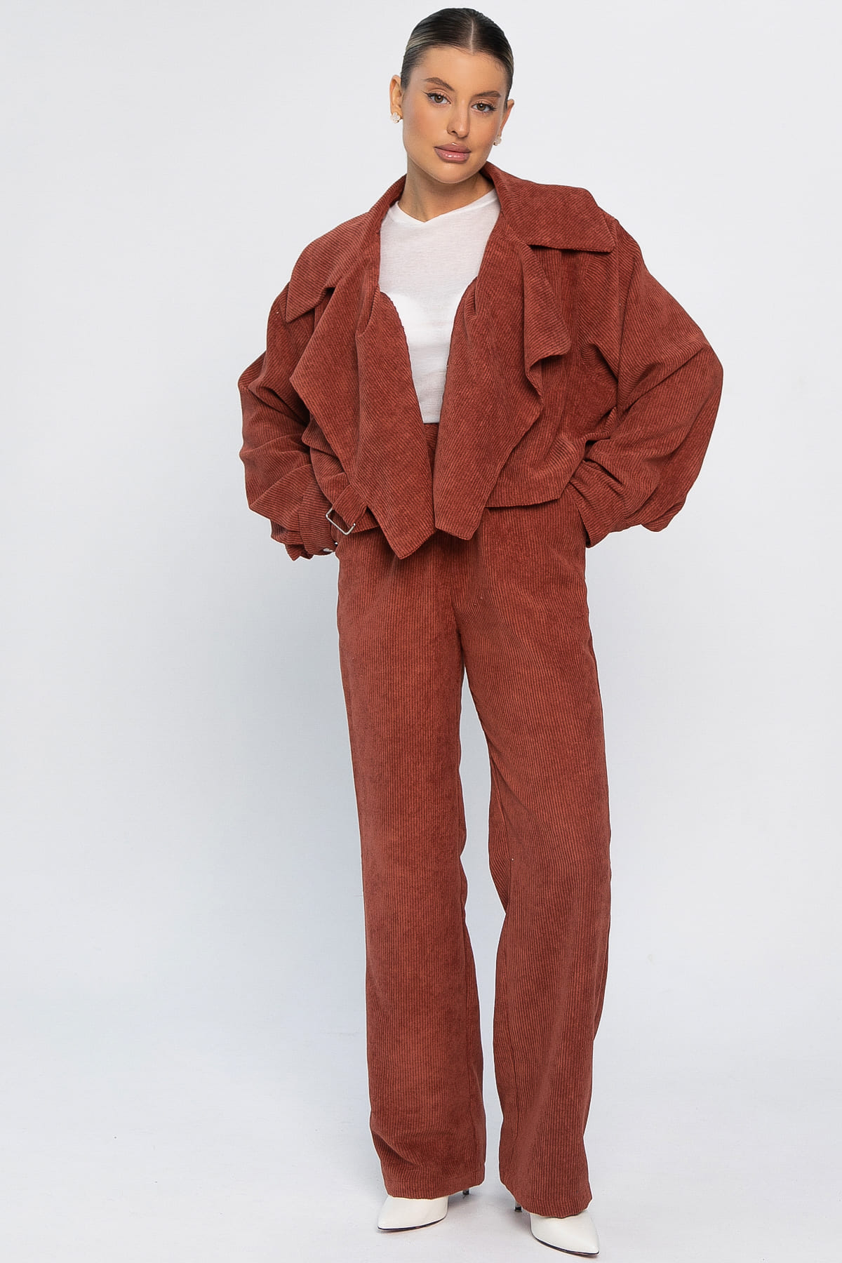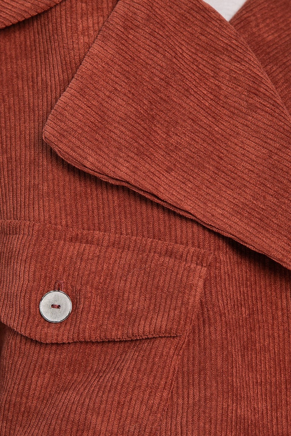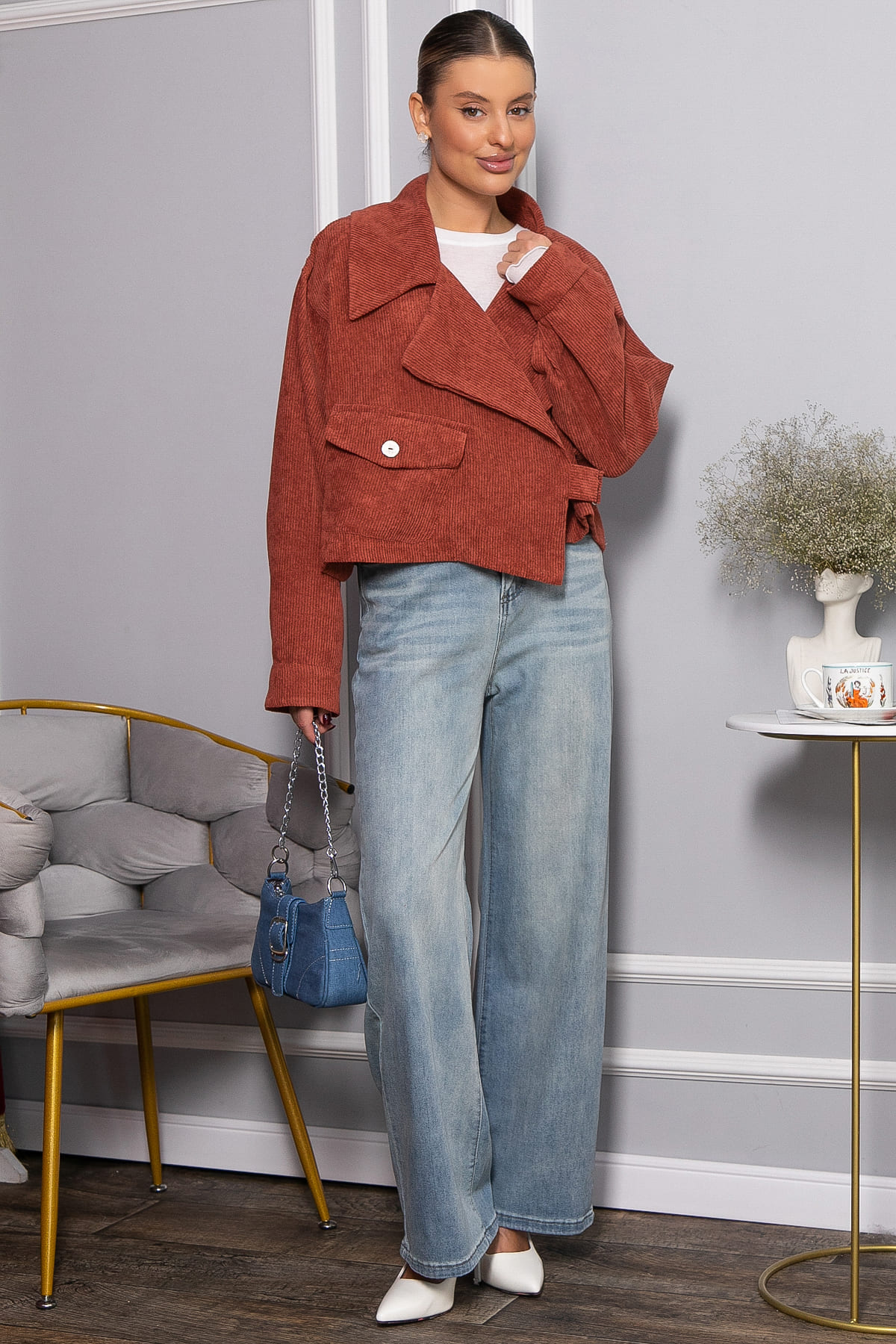Укороченный вельветовый жакет – это утонченный и женственный элемент гардероба, способный дополнить любой образ. Он отлично подходит как для повседневных прогулок, так и для создания романтичного ансамбля. Рекомендуем сочетать его с брюками из той же ткани прямого кроя. Жакет имеет оригинальную застежку на хлястик. На правой полочке расположен асимметричный накладной карман с клапаном. Рукава со спущенной проймой, а низ рукава оформлен застегивающейся манжетой.