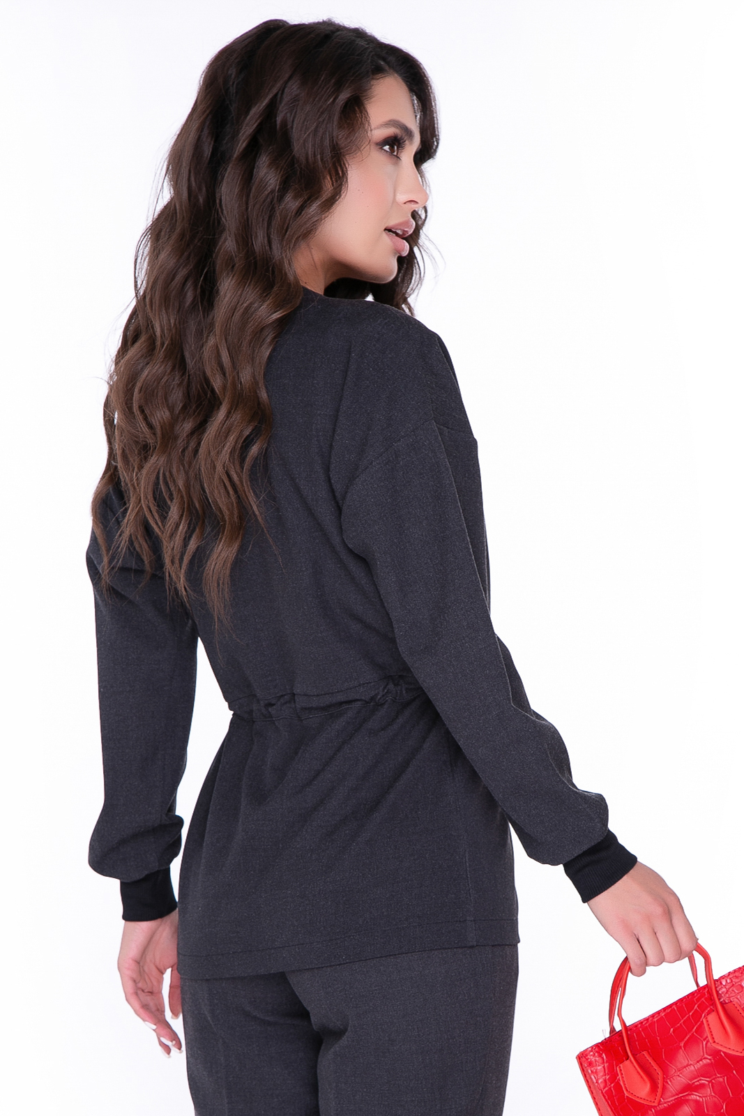 - Поясок - кулиска позволяет подчеркнуть талию, наконечники красного цвета добавляют образу цвета и стиля. Рукав и отделка воротника оформлены черной резинкой;